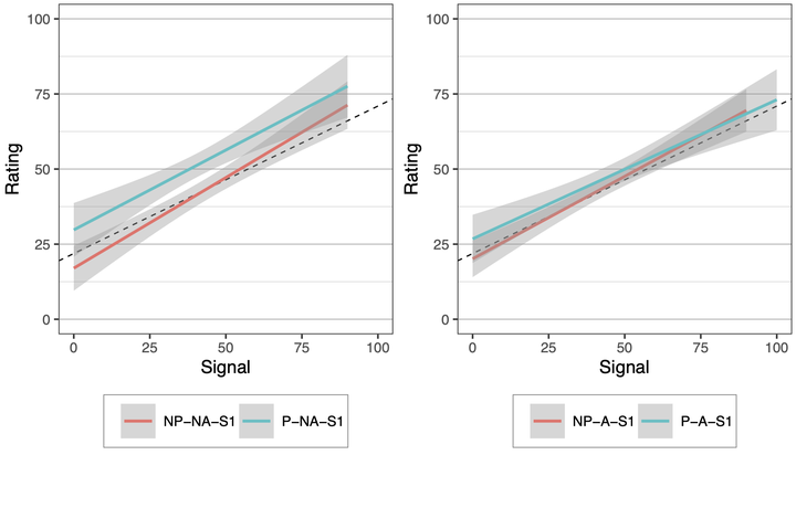 The effect of performance pay on ratings in treatments with one signal. The dashed black line denotes the optimal rating function for supervisors without social preferences (𝜂 = 0).